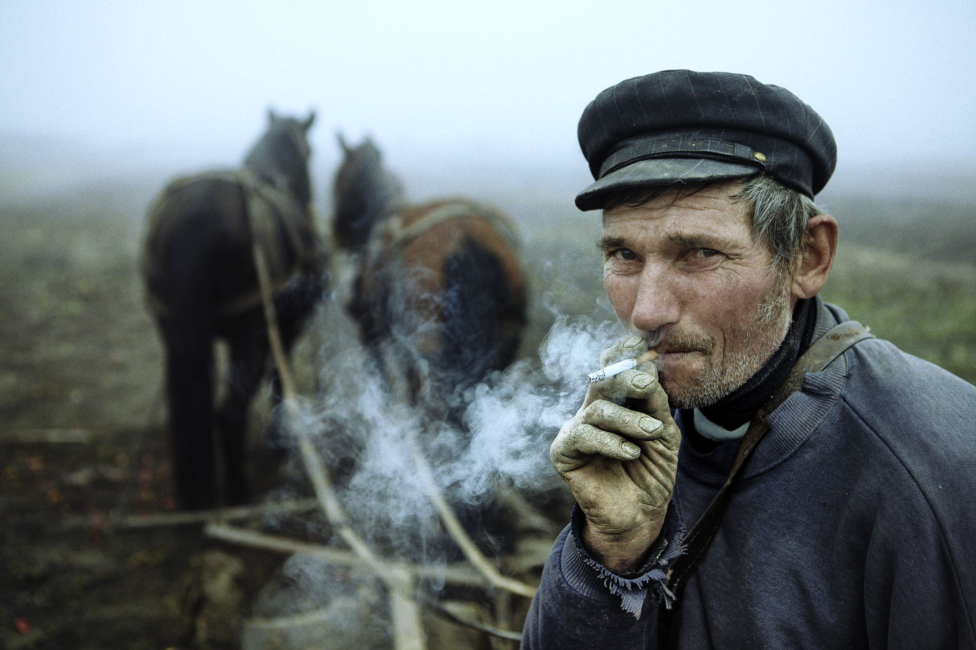 It's clear which is more powerful—the hat, horses, smoke and fog create story, mood, and sense of place.